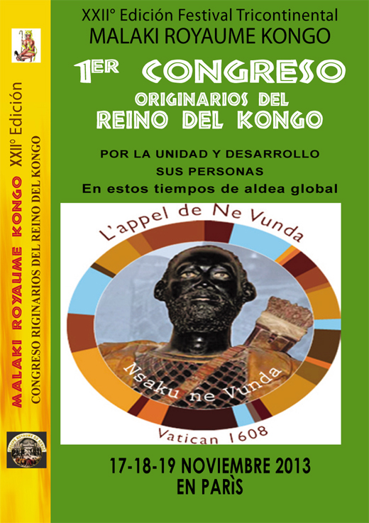 ahora el sonido (ranura del tambor) de “Unidad y Desarrollo Originario de Kongo Reino” que resuena Vunda hacer en Roma desde 1608, suena más fuerte. De 17 a 19 noviembre 2013 en París, del Kongo Unidos se reunirán en París en circunstancias modestas, para crear las bases de una verdadera UNIDAD Y DESARROLLO DE ORIGINARIOS DEL REINO DEL KONGO.